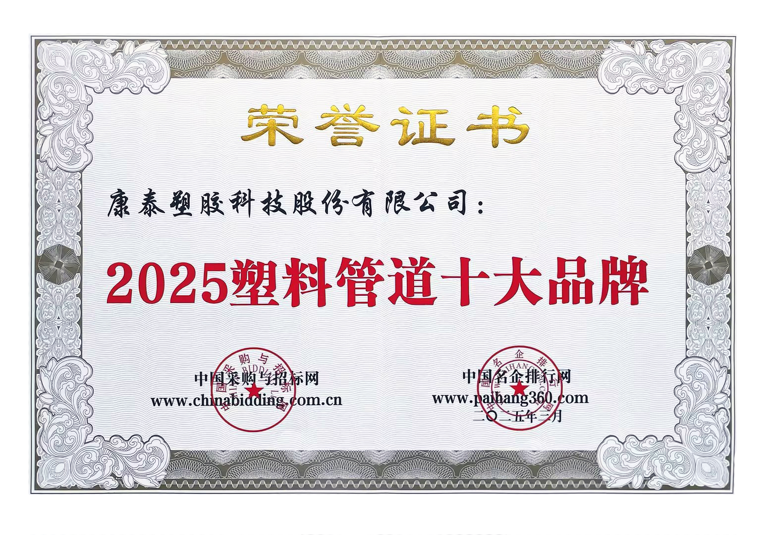康泰集團榮膺中國輕工塑料管道行業(yè)十強企業(yè)2025/07/28 3264近日,中國塑料加工工業(yè)協(xié)會公布中國輕工塑料管道行業(yè)十強企業(yè)入圍名單,康...read more